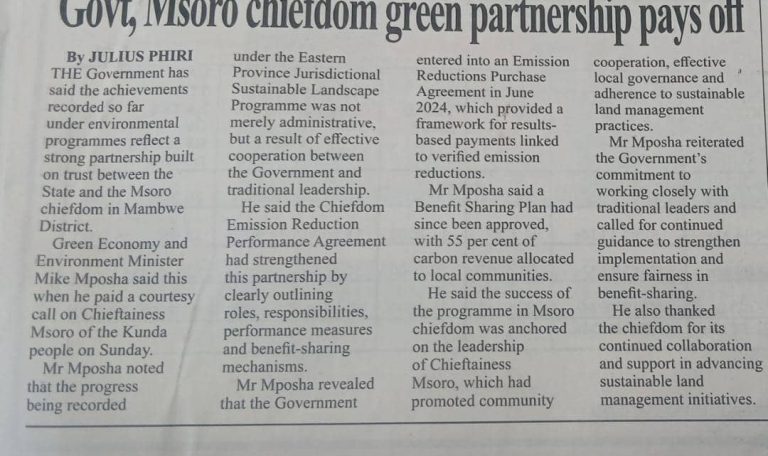 Creavat Chituta Chipata April 7, 2026 Govt, Msoro Chiefdom green partnership pays off Tuesdays Edition Times of Zambia Newspaper #ClimateChange#ClimateMitigation#CarbonEmissions#CarbonMarkets Chief Mpezeni Calls for Forest Protection Laws Leave a Reply Cancel replyYour email address will not be published. Required fields are marked *Comment * Name * Email * Website Save my name, email, and website in this browser for the next time I comment.